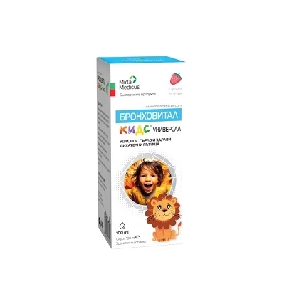 БРОНХОВИТАЛ КИДС УНИВЕРСАЛ 100 МЛ е натурална хранителна добавка за деца, която подпомага нормалното функциониране и естествените пречистващи функции на лигавиците на дихателните пътища. Способства за ефективния имунен отговор и допринася за защита на клетките от оксидативен стрес. Благоприятства естествената активност на слуховия анализатор, обонянието, подкрепя нормалната гласова функция. Стабилизира реактивността към факторите на външната среда.Активни съставки:Плодът от черен бъз: съдържа полезни багрила, проантоцианидини, а също така гликозиди, витамини и други съставки, които сумарно имат благоприятен ефект върху имунната и храносмилателната системи. Концентрираните билкови екстракти, които се използват в Бронховитал кидс универсал, позволяват постигането на ефективност при много по-малки количества в сравнение с домашно приготвените сиропи.Теснолистният живовляк: изпитано средство за улесняване отделянето на секретите от дихателните пътища. Органичният силиций, който съдържа, укрепва белодробните тъкани, което повишава тяхната устойчивост спрямо инфекции, включително туберкулозни.Петопръстник: притежава противовъзпалителни, подсушаващи и имуноактивни свойства. Особено ценен при остри или често изострящи се инфекции на синусите, гърлото и бронхите.Пищялка(ангелика): антимикробно и пречистващо действие. Оказва благотворен ефект върху средното и вътрешно ухо. Те често биват засегнати от дихателните инфекции при децата.Андрографис: действа противовирусно, включително срещу причинителите на грипа и мощно пречиства черния дроб – основен фактор за подобряване на общото състояние на организма.Дълъг пипер: има имуноактивизиращ и антиалергичен ефект, традиционно се е ползвал при хрема и кашлица.L–лизин: есенциална аминокиселина с много важно значение за имунитета, особено срещу вируси. Поощрява правилния растеж и развитие на детето.Цинк: като цинков цитрат - органична, оптимално усвоима форма. Подкрепя имунитета, подобрява състоянието на кожата и лигавиците и директно участва в дихателния процес.Манган: участва в клетъчната обмяна на веществата и повишава устойчивостта на нервните структури и слухово-равновесния орган.Селен: като L-селенометионин. Осигурява антиоксидантна защита.